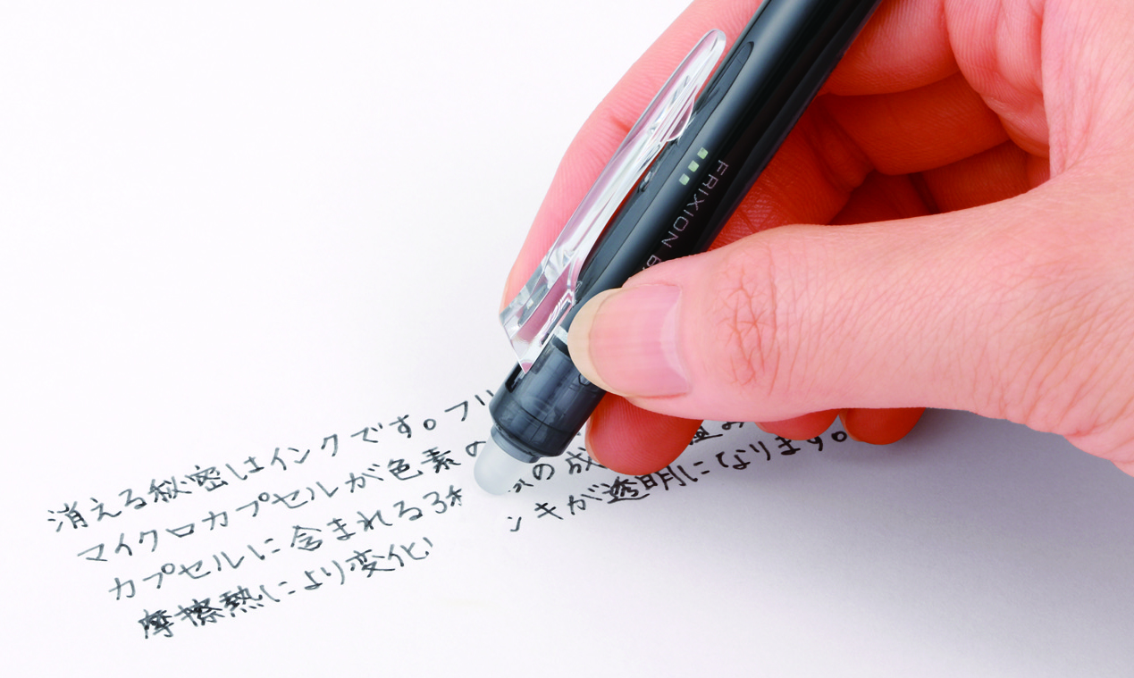 「フリクション」シリーズのインキは、特殊なマイクロカプセルに「発色剤」、「発色させる成分」、「変色温度調整剤」の3つの成分を内包しています。常温時には「発色剤」と「発色させる成分」が結合して色を発色させますが、摩擦熱によって設定温度に達すると、「変色温度調整剤」の働きにより結合が解かれ、インキの色が消える仕組みです。従来の消しゴムを使う筆記具とは異なり、消しカスが出ず、消し残りもないのが特長です。