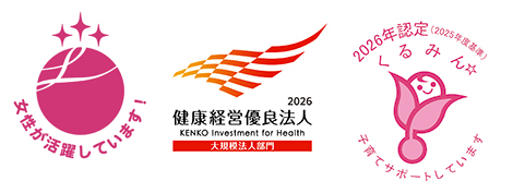 当社は「くるみん認定」に加え、女性活躍推進の「えるぼし認定(最高位3つ星)」、そして「健康経営優良法人」を取得しています。これら3つの認定は、多様な人財が安心して働ける環境づくりに取り組んできた当社の姿勢が評価されたものです。